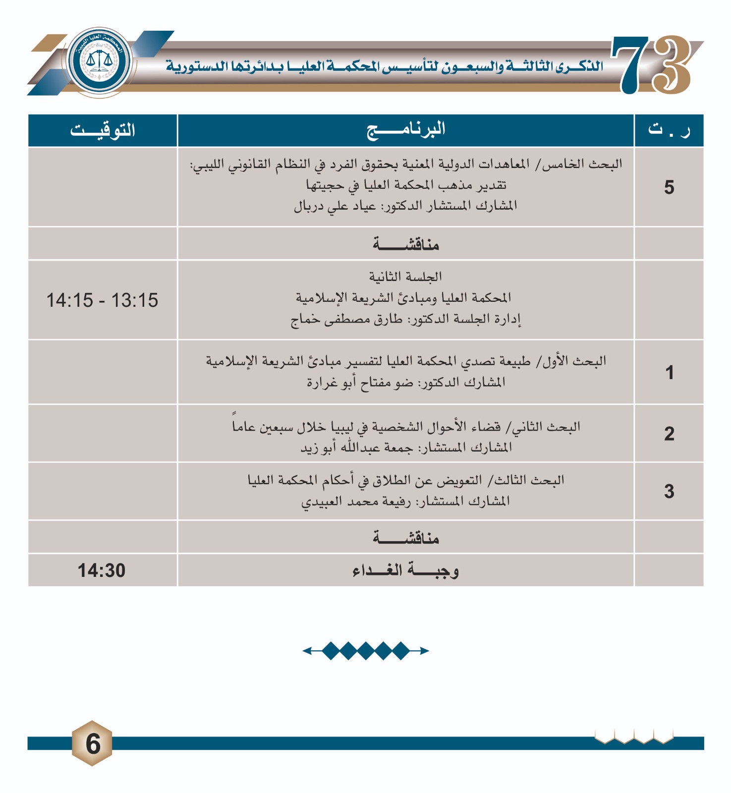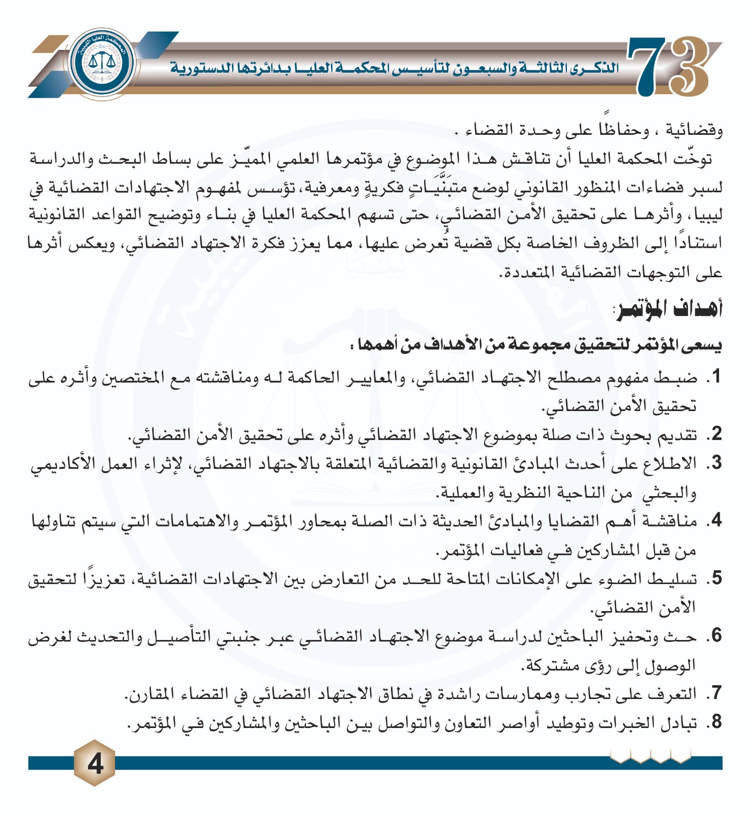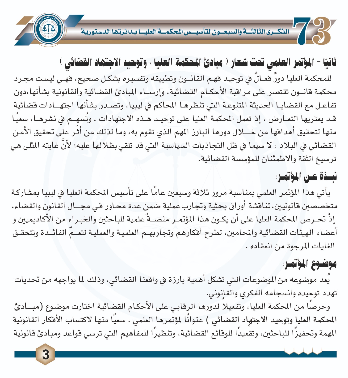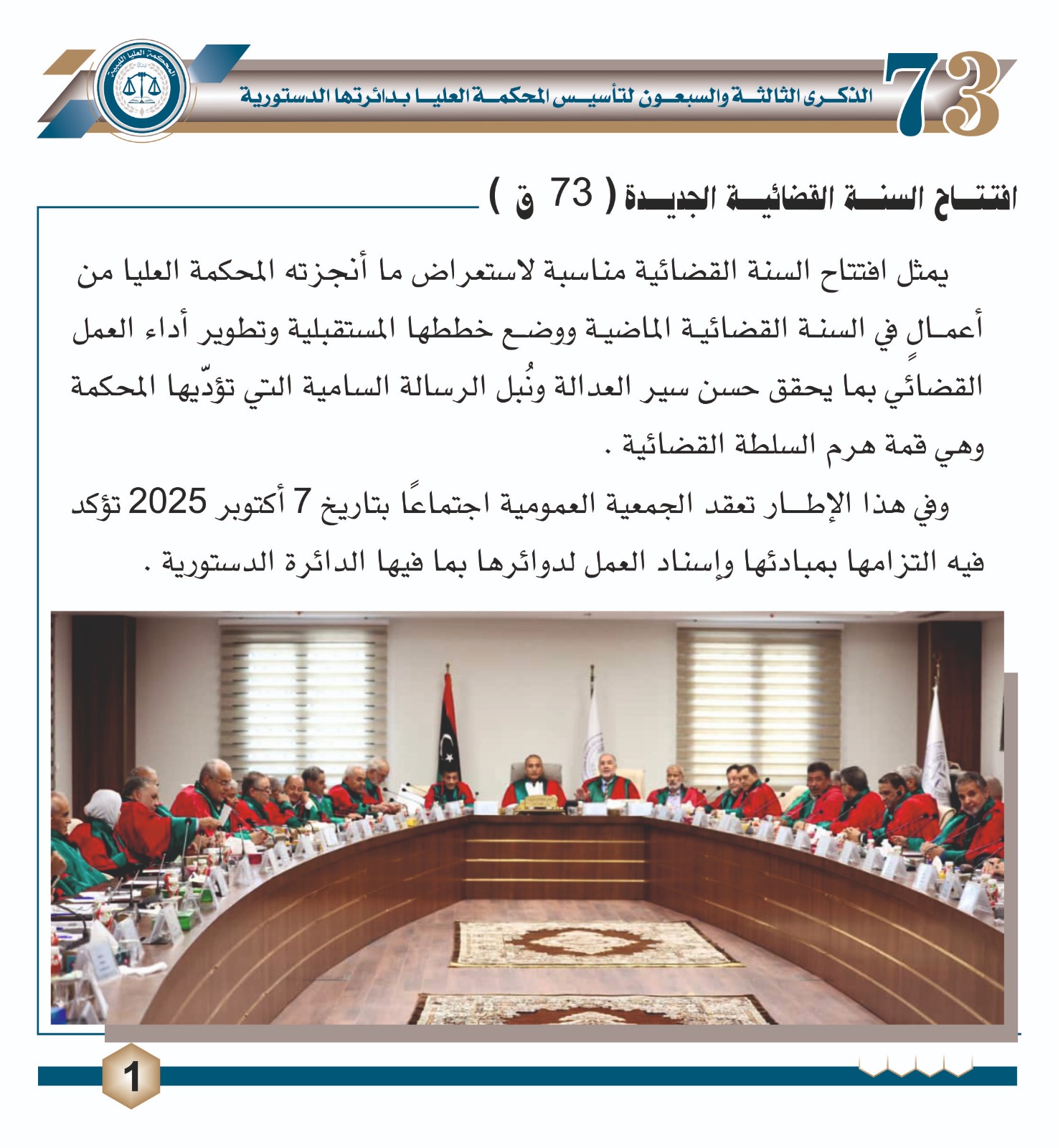 بمناسبةِ مرورِ ثلاثةِ وسبعين عامًا على تأسيس المحكمةِ العليا تقام يومي 7و8 أكتوبر 2025م بمقرها بمدينة طرابلس احتفالية تتزامن مع افتتاح السنة القضائية الجديدة، وتكريم رجالاتها المتقاعدين كما سيقام مؤتمر علمي بعنوان “مبادئ المحكمة العليا وتوحيد الاجتهاد القضائي ” بمشاركة صفوة من المتخصصين في القانون والقضاء.