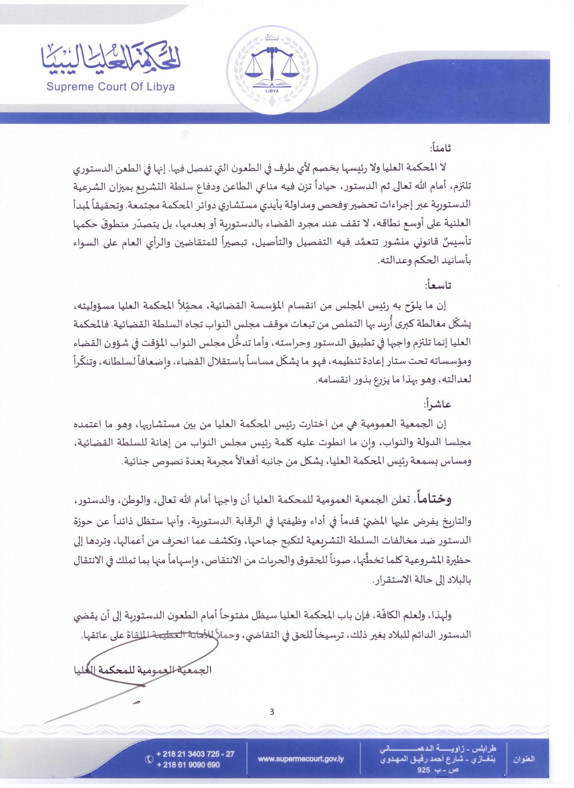 بيان الجمعية العمومية للمحكمة العليا .